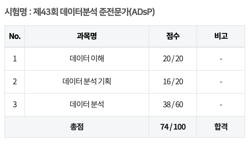 한 번에 붙지 못한 게 아깝다기보다, 두 번 준비하면서 ADsP의 구조와 3과목의 성격을 더 명확하게 이해하게 됐다는 점에서 오히려 잘됐다고 생각하기도 한다.