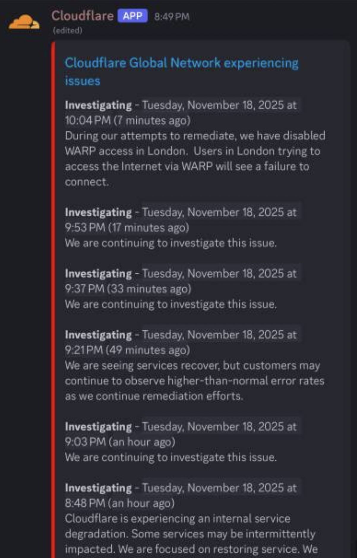 로그인·매칭·컨트롤 플레인 + 런처/패치가 Cloudflare에 엮여 있기 때문에 에러가 발생한다.